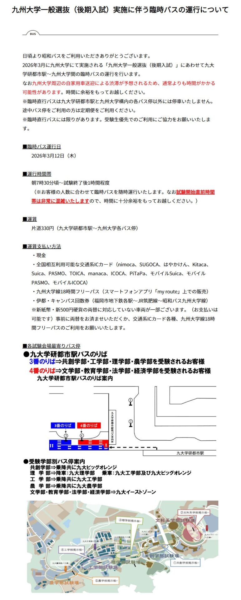 九州大学では前期試験の2月25日と26日の両日、伊都キャンパス受験者向けに、博多発→伊都キャンパス直行の『貸切バス』を運行します。