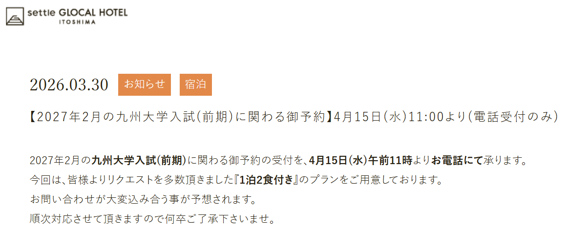 なかでも九大伊都キャンパスにいちばん近いグローカルホテル糸島では、早期に電話予約受付が始まります↓