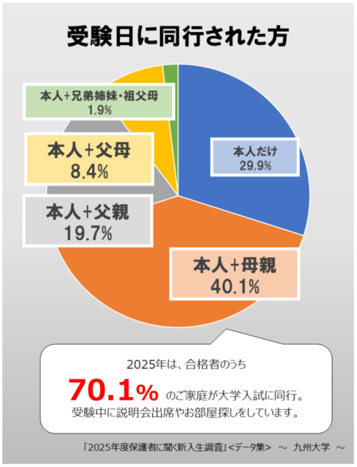 九州大学「2025年度保護者に聞く新入生調査」によると、2025年は合格者のうち『70.1%』のご家庭が、大学入試に同行されています↓