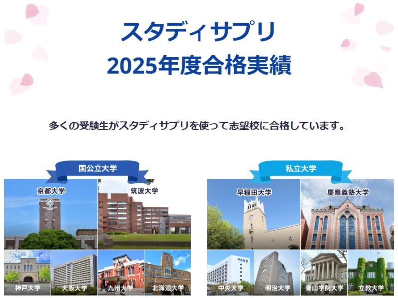 毎年多くの受験生がスタディサプリを使い、難関大をはじめとする志望大に合格しています。