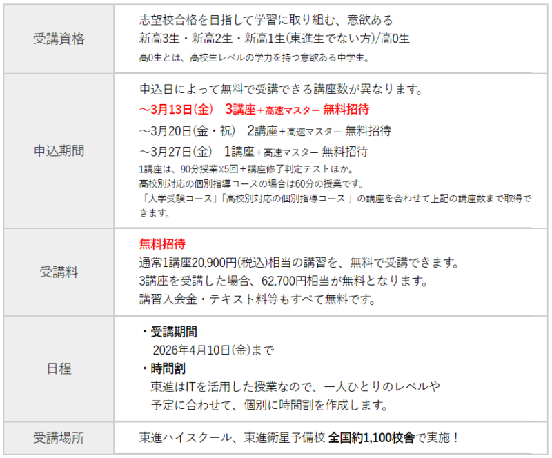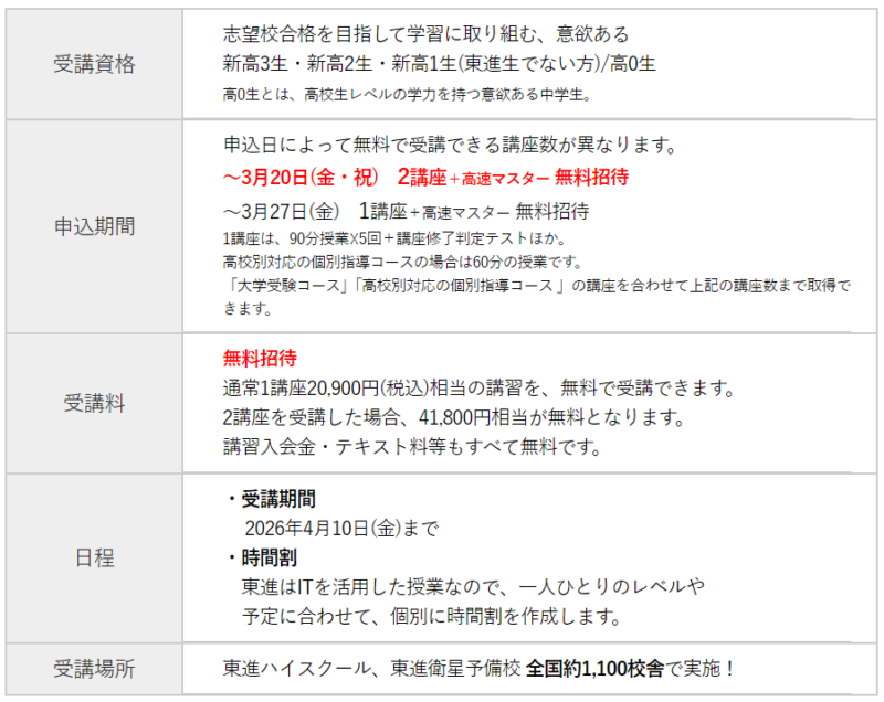 - 東進『新年度特別招待講習』受付中